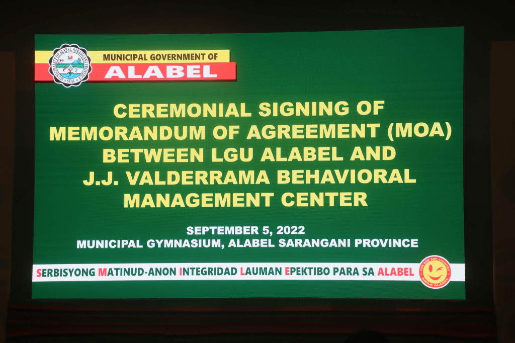 ALABEL, Sarangani Province (Setyembre 05, 2022) – Nagmalampuson ang gipahigayon nga Ceremonial Signing sa Memorandum of Agreement (MOA) sa Lokal nga Panggamhanan sa Alabel ug J.J. Valderrama Behavioral Center, Lunes sa buntag, Setyembre 05, 2022 atul sa gipahigayon nga flag-raising ceremony sa Alabel Municipal Civic Gymnasium.